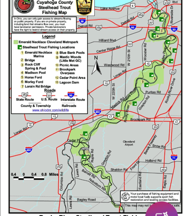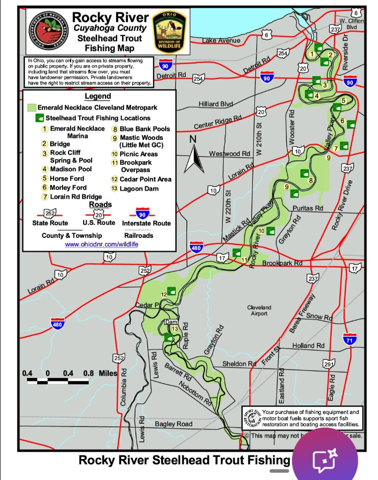 Welcome to some of the best fishing in Ohio. The Rocky River is one of Northeast Ohio’s top Lake Erie tributaries and it is known for strong steelhead runs from fall into early spring. The river flows from Medina County up to Lake Erie and has everything you want including deep holes, moving water, shale shelves, and quiet wooded stretches. Along with steelhead you can catch smallmouth, largemouth, northern pike, walleye, white bass, carp, and plenty of panfish depending on the time of year. Water levels and temperature change with the seasons so paying attention makes a difference. Whether you are drifting bait in the cold months or throwing lures for smallmouth in the summer, the Rocky is the real deal and it is right here at home.